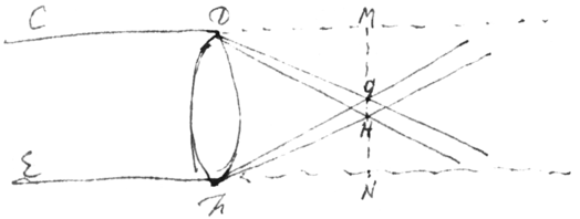 CD & EF two lines parallel to its axis in or \indefinitely/ neare to wch all variety of difform rays are successively incident on two opposite parts of its Perimeter. And of those rays let DH & FG be the most refracted & DG & FH the least refracted intersecting the former in G & H. Draw GH & pr{illeg}|o|duce it both ways till at M & N it occur with CD & EF {illeg} also produced. Now since by my Principles the difference of refraction of the most difform rays is about the 24th or 25t part of their whole refraction, the angle GDH will be about a 25t part of the angle MDH & consequently the subtense GH (wch is the diameter of the least space into wch the refracted rays converge) will be about a 25t part of the subtens MH & therefore about a 49th part of ye whole line MN the diameter of the lens; or in round numbers about a fiftith part as I asserted.