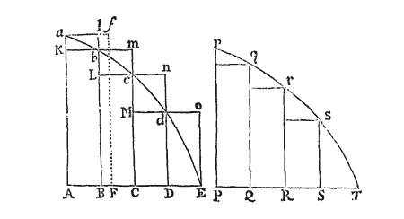 æqualibus, & lateribus Bb, Cc, Dd, &c. figuræ lateri Aa parallelis comenta; & compleantur parallelogramma aKbl, bLcm, cMdn, &c, Dein horum parallelogrammorum latitudo minuatur, & numerus augeatur in infinitum: dico quod ultimæ rationes, quas habent ad se invicem figura inscripta AKbLcMdD, circumscripta AalbmcndoE, & curvilinea AabcdE, sunt rationes æqualitatis.
