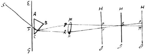 A B C representeth ye Prism set endwise to sight, close by ye hole F of ye window E G. Its vertical angle A C B may conveniently be about 60 degrees. M N designes ye lens. Its breadth 2 or 3 inches. S F one of ye streight lines in wch difform rayes may be conceived to flow successively from ye Sun. F P & F R two of those rayes unequally refracted, which ye Lens makes to converg towards Q, & after decussation to diverge again. And H I ye paper at divers distances on which ye colours are projected: which in Q constitute whitenesse, but are red & yellow in R, r, & ρ; & blew & purple in P, p & π.