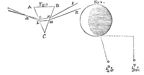 in which the rays are not so far distant from one another at GL, but that the hole, had I exprest it, might have been put there, and yet have comprehended them. But if we should put the hole at x, their decussation; yet will it not be any thing to his purpose; the distance xG or xL being but about half the breadth of a side of the Prism ( AC) which I conceive is not the twentieth part of the distance requisite in his conjecture.