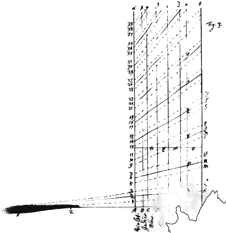 4, 9, & 14 & between ZA & ZH eleven mean proportionalls, of wch let ZB be ye secon{illeg}|d|, ZC the third, ZD the fift, ZE ye seventh, ZF ye ninth, & ZG the tenth. And at the points A, B, C, D, E, F, G, H, let perpendiculars Aα, Bβ, &c. be erected, by whose intervalls, the extent of the severall colours set underneath agt ym, is to be represented. Then divide the line Aα in such proportion as the numbers 1, 2, 3; 5, 6, 7; 9, 10, 11; &c. set at the point of division denote. And through those divisions from Y draw lines 1J, 2K, 3L; 5M, 6N, 7O; &c