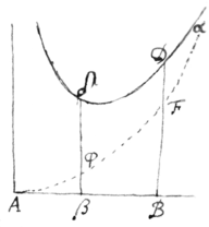 BD: nempe, posito & , erit superficiei per BF descriptæ, & descriptæ per DF. Et hoc semper accidit cum indices rationum basis x in valore superficiei quæsitæ sint varijs signis affectæ. In hujus modi casibus pars aliqua BDδβ superficiei media (quæ sola dari poterit, cùm superficies sit utrinqꝫ infinita) sic invenitur. Subtrahe superficiem ad minorem basin Aβ pertinentem a Superficie ad majorem basin AB pertinente{illeg} & habebis βBDδ superficiem differentiæ {illeg}|b|asium insistentem. Sic in hoc exemplo, Si & , erit . Enim superficies ad AB pertinens (viz ) erit , sive ; Et superficies ad Aβ pertinens (viz ) erit , sive : Et earum differentia (viz ) erit sive . Eodem modo si , & erit . Sic si , & ; Erit .