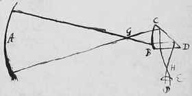 at pleasure in my Telescope, |will| appear by this figure, where A represents the great Concave, E the Eye-Glasse, and BCD a Prisme of Glasse or Crystall whose sides BC & BD are not flat but spherically convex, so that \ye/ rays which come from G the focus of the great concave A, may by the refraction of the first side {illeg} \BC/ be reduced into parallelism, and after reflection from the base CD be made by the refraction of the next side BD to converge to the focus of the Eye-Glass H. The Telescop{e} being thus formed it appears how the charge may be altered by varying the distances of the glasses and speculum.