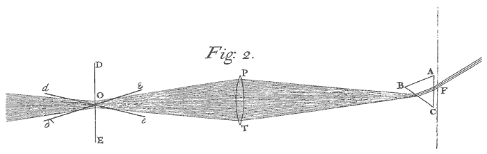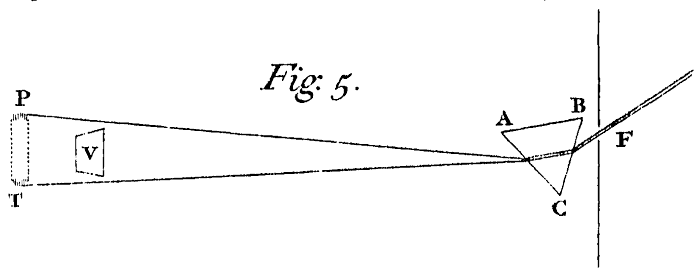 The Sun's Light let into a dark Chamber through the round Hole F,[Image 2] half an Inch wide, passed first through the Prism ABC placed at the Hole, and then through a Lens PT something more than four Inches broad, and about eight Feet distant from the Prism, and thence converged to O the Focus of the Lens distant from it about three Feet, and there fell upon a white Paper DE. If that Paper was perpendicular to that Light incident upon it, as 'tis represented in the posture DE, all the Colours upon it at O appeared white. But if the Paper being turned about an Axis parallel to the Prism, became very much inclined to the Light, as 'tis represented in the Positions de and δε; the same Light in the one case appeared yellow and red, in the other blue. Here one and the same part of the Light in one and the same place, according to the various inclinations of the Paper, appeared in one case white, in another yellow or red, in a third blue, whilst the confine of Light and Shadow, and the refractions of the Prism in all these cases remained the same.