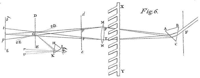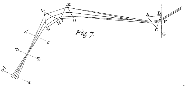 Let that Spectrum or solar Image PT fall now upon the Lens MN above four Inches broad,[Image 7] and about six Feet distant from the Prism ABC, and so figured that it may cause the coloured Light which divergeth from the Prism to converge and meet again at its Focus G, about six or eight Feet distant from the Lens, and there to fall perpendicularly upon a white Paper DE. And if you move this Paper to and fro, you will perceive that near the Lens, as at de, the whole solar Image (suppose at pt) will appear upon it intensely coloured after the manner above-explained, and that by receding from the Lens those Colours will perpetually come towards one another, and by mixing more and more dilute one another continually, until at length the Paper come to the Focus G, where by a perfect mixture they will wholly vanish and be converted into whiteness, the whole Light appearing now upon the Paper like a little white Circle. And afterwards by receding further from the Lens, the rays which before converged will now cross one another in the Focus G, and diverge from thence, and thereby make the Colours to appear again, but yet in a contrary order; suppose at δε, where the red t is now above which before was below, and the violet p is below which before was above.