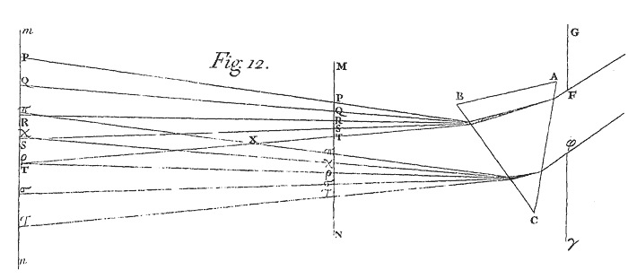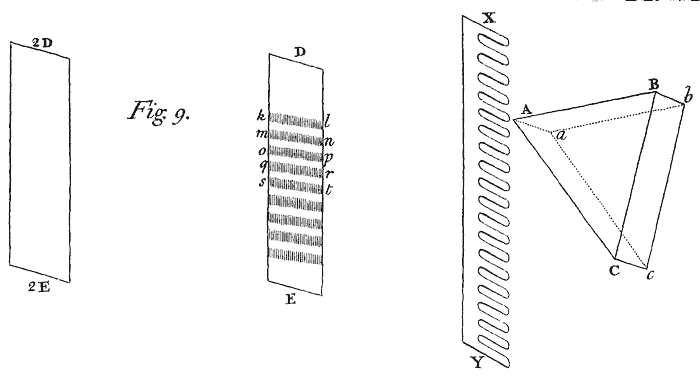The Sun shining through a large Prism ABC upon a Comb XY,[Image 10] placed immediately behind the Prism, his Light which passed through the interstices of the Teeth fell upon a white Paper DE. The breadths of the Teeth were equal to their interstices, and seven Teeth together with their Interstices took up an Inch in breadth. Now when the Paper was about two or three Inches distant from the Comb, the Light which passed through its several interstices painted so many ranges of Colours, kl, mn, op, qr, &c. which were parallel to one another and contiguous, and without any mixture of white. And these ranges of Colours, if the Comb was moved continually up and down with a reciprocal motion ascended and descended in the Paper, and when the motion of the Comb was so quick, that the Colours could not be distinguished from one another, the whole Paper by their confusion and mixture in the Sensorium appeared white.