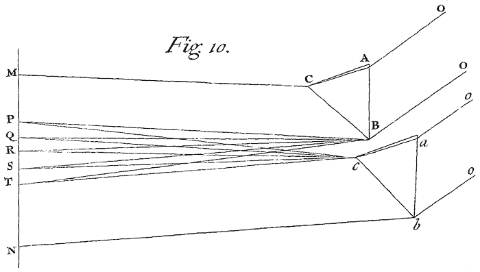 In the foregoing Experiment the several intervals of the Teeth of the Comb do the office of so many Prisms, every interval producing the Phænomenon of one Prism. Whence instead of those intervals using several Prisms, I try'd to compound whiteness by mixing their Colours, and did it by using only three Prisms, as also by using only two as follows. Let two Prisms ABC and abc,[Image 11] whose refracting Angles B and b are equal, be so placed parallel to one another, that the refracting Angle B of the one may touch the Angle c at the base of the other, and their Planes CB and cb, at which the rays emerge, may lye in directum. Then let the Light trajected through them fall upon the Paper MN, distant about 8 or 12 Inches from the Prisms. And the Colours generated by the interior Limits B and c of the two Prisms, will be mingled at PT, and there compound white. For if either Prism be taken away, the Colours made by the other will appear in that Place PT, and when the Prism is restored to its place again, so that its Colours may there fall upon the Colours of the other, the mixture of them both will restore the whiteness.