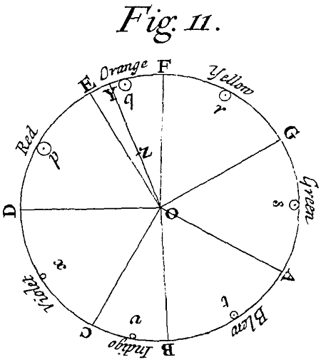 With the Center O and Radius OD describe a Circle ADF,[Image 12] and distinguish its circumference into seven parts DE, EF, FG, GA, AB, BC, CD, proportional to the seven musical Tones or Intervals of the eight Sounds, Sol, la, fa, sol, la, mi, fa, sol, contained in an Eight, that is, proportional to the numbers , , {}, , , , {}. Let the first Part DE represent a red Colour, the second EF orange, the third FG yellow, the fourth GH green, the fifth AB blue, the sixth BC indico, and the seventh CD violet. And conceive that these are all the Colours of uncompounded Light gradually passing into one another, as they do when made by Prisms; the circumference DEFGABCD, representing the whole series of Colours from one end of the Sun's coloured Image to the other, so that from D to E be all degrees of red, at E the mean Colour between red and orange, from E to F all degrees of orange, at F the mean between orange and yellow, from F to G all degrees of yellow, and so on. Let p be the center of gravity of the Arch DE, and q, r, s, t, v, x, the centers of gravity of the Arches EF, FG, GA, AB, BC and CD respectively, and about those centers of gravity let Circles proportional to the number of rays of each Colour in the given mixture be described; that is, the Circle p proportional to the number of the red-making rays in the mixture, the Circle q proportional to the number of the orange-making rays in the mixture, and so of the rest. Find the common center of gravity of all those Circles p, q, r, s, t, v, x. Let that center be Z; and from the center of the Circle ADF, through Z to the circumference, drawing the right Line OY, the place of the Point Y in the circumference shall shew the Colour arising from the composition of all the Colours in the given mixture, and the Line OZ shall be proportional to the fulness or intenseness of the Colour, that is, to its distance from whiteness. As if Y fall in the middle between F and G, the compounded Colour shall be the best yellow; if Y verge from the middle towards F or G, the compounded Colour shall accordingly be a yellow, verging towards orange or green. If Z fall upon the circumference the Colour shall be intense and florid in the highest degree; if it fall in the mid way between the circumference and center, it shall be but half so intense, that is, it shall be such a Colour as would be made by diluting the intensest yellow with an equal quantity of whiteness; and if it fall upon the center O, the Colour shall have lost all its intenseness, and become a white. But it is to be noted, That if the point Z fall in or near the line OD, the main ingredients being the red and violet, the Colour compounded shall not be any of the prismatic Colours, but a purple, inclining to red or violet, accordingly as the point Z lieth on the side of the line DO towards E or towards C, and in general the compounded violet is more bright and more fiery than the uncompounded. Also if only two of the primary Colours which in the circle are opposite to one another be mixed in an equal proportion, the point Z shall fall upon the center O, and yet the Colour compounded of those two shall not be perfectly white, but some faint anonymous Colour. For I could never yet by mixing only two primary Colours produce a perfect white. Whether it may be compounded of a mixture of three taken at equal distances in the circumference I do not know, but of four or five I do not much question but it may. But these are curiosities of little or no moment to the understanding the Phænomena of nature. For in all whites produced by nature, there uses to be a mixture of all sorts of rays, and by consequence a composition of all Colours.