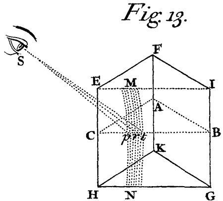 <124>What is said of Colours made by Prisms may be easily applied to Colours made by the Glasses of Telescopes, or Microscopes, or by the humours of the Eye. For if the Object-glass of a Telescope be thicker on one side than on the other, or if one half of the Glass, or one half of the Pupil of the Eye be covered with any opake substance: the Object-glass, or that part of it or of the Eye which is not covered, may be considered as a Wedge with crooked sides, and every Wedge of Glass or other pellucid substance has the effect of a Prism in refracting the Light which passes through it.
