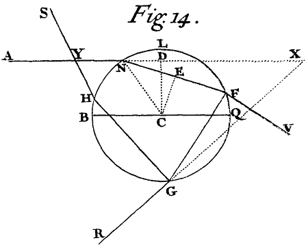 This Bow never appears but where it rains in the Sun-shine, and may be made artificially by spouting up Water which may break aloft, and scatter into Drops, and fall down like Rain. For the Sun shining upon these Drops certainly causes the Bow to appear to a Spectator standing in a due position to the Rain and Sun. And hence it is now agreed upon, that this Bow is made by refraction of the Sun's Light in Drops of falling Rain. This was understood by some of the Ancients, and of late more fully discovered and explained by the Famous Antonius de Dominis Archbishop of Spilato, in his Book De Radiis Visus & Lucis, published by his Friend Bartolus at Venice, in the Year 1611, and written above twenty Years before. For he teaches there how the interior Bow is made in round Drops of Rain by two refractions of the Sun's Light, and one reflexion between them, and the exterior by two refractions and two sorts of reflexions between them in each Drop of Water, and proves his Explications by Experiments made with a Phial full of Water, and with Globes of Glass filled with Water, and placed in the Sun to make the Colours of the two Bows appear in them. The same Explication Des-Cartes hath pursued in his Meteors, and mended that of the exterior Bow. But whilst they understood not the true Origin of Colours, it's necessary to pursue it here a little further. For understanding therefore how the Bow is made, let a Drop of Rain, or any other spherical transparent Body be represented by the Sphere BNFG,[Image 15] described with the Center C, and Semi-diameter CN. And let AN be one of the Sun's rays incident upon it at N, and thence refracted to F, where let it either go out of the Sphere by refraction towards V, or be reflected to G; and at G let it either go out by refraction to R, or be reflected to H; and at H let it go out by refraction towards S, cutting the incident ray in Y; produce AN and RG, till they meet in X, and upon AX and NF let fall the perpendiculars CD and CE, and produce CD till it fall upon th circumference at L. Parallel to the incident ray AN draw the Diameter BQ, and let the sine of incidence out of Air into Water be to the sine of refraction as I to R. Now if you suppose the point of incidence N to move from the Point B, continually till it come to L, the Arch QF will first increase and then decrease, and so will the Angle AXR which the rays AN and GR contain; and the Arch QF and Angle AXR will be biggest when ND is to CN as to , in which case NE will be to ND as 2R to I. Also the Angle AYS which the rays AN and HS contain will first decrease, and then increase and grow least when ND is to CN as to , in which case NE will be to ND, as 3R to I. And so the Angle which the next emergent ray (that is, the emergent ray after three reflexions) contains with the incident ray AN will come to its limit when ND is to CN as to , in which case NE will be to ND as 4R to I. And the Angle which the ray next after that emergent, that is, the ray emergent after four reflexions, contains with the incident will come to its limit, when ND is to CN as to , in which case NE will be to ND as 5R to I; and so on infinitely, the Numbers 3, 8, 15, 24, &c. being gathered by continual addition of the terms of the arithmetical progression 3, 5, 7, 9, &c. The truth of all this Mathematicians will easily examine.