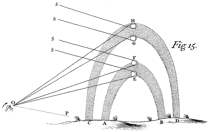 Suppose now that O is the Spectator's Eye,[Image 16] and OP a line drawn parallel to the Sun's rays, and let POE, POF, POG, POH, be Angles of 40 degr. 17 min. 42 degr. 2 min. 50 degr. 57 min. and 54 degr. 7 min. respectively, and these Angles turned about their common side OP, shall with their other sides OE, OF; OG, OH describe the verges of two Rain-bows AFBE and CHDG. For if E, F, G, H, be Drops placed any where in the conical superficies described by OE, OF, OG, OH, and be illuminated by the Sun's rays SE, SF, SG, SH; the Angle SEO being equal to the Angle POE or 40 degr. 17 min. shall be the greatest Angle in which the most refrangible rays can after one reflexion be refracted to the Eye, and therefore all the Drops in the line OE shall send the most refrangible rays most copiously to the Eye, and thereby strike the senses with the deepest violet Colour in that region. And in like manner the Angle SFO being equal to the Angle POF, or 42 degr. 2 min. shall be the greatest in which the least refrangible rays after one reflexion can emerge out of the Drops, and therefore those rays shall come most copiously to the Eye from the Drops in the line OF, and strike the senses with the deepest red Colour in that region. And by the same argument, the rays which have intermediate degrees of refrangibility shall come most copiously from Drops between E and F, and strike the senses with the intermediate Colours in the order which their degrees of refrangibility require, that is, in the progress from E to F, or from the inside of the Bow to the outside in this order, violet, indico, blue, green, yellow, orange, red. But the violet, by the mixture of the white Light of the Clouds, will appear faint and incline to purple.