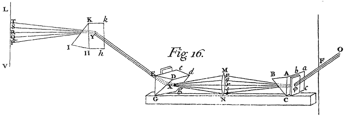 FOR if the Sun shine into a very dark Chamber through an oblong Hole F,[Image 1] whose breadth is the sixth or eighth part of an Inch, or something less; and his Beam FH do afterwards pass first through a very large Prism ABC, distant about 20 Feet from the Hole, and parallel to it, and then (with its white part) through an oblong Hole H, whose breadth is about the fortieth or sixtieth part of an Inch, and which is made in a black opake Body GI, and placed at the distance of two or three Feet from the Prism, in a parallel situation both to the Prism and to the former Hole, and if this white Light thus transmitted through the Hole H, fall afterwards upon a white Paper pt, placed after that Hole H, at the distance of three or four Feet from it, and there paint the usual Colours of the Prism, suppose red at t, yellow at s, green at r, blue at q, and violet at p; you may with an Iron Wire, or any such like slender opake Body, whose breadth is about the tenth part of an Inch, by intercepting the rays at k, l, m, n or o, take away any one of the Colours at t, s, r, q or p, whilst the other Colours remain upon the Paper as before; or with an obstacle something bigger you may take away any two, or three, or four Colours together, the rest remaining: So that any one of the Colours as well as violet may become outmost in the confine of the shadow towards p, and any one of them as well as red may become outmost in the confine of the shadow towards t, and any one of them may also border upon the shadow made within the Colours by the obstacle R intercepting some intermediate part of the Light; and, lastly, any one of them by being left alone may border upon the shadow on either hand. All the Colours have themselves indifferently to any confines of shadow, and therefore the differences of these Colours from one another, do not arise from the different confines of shadow, whereby Light is variously modified, as has hitherto been the Opinion of Philosophers. In trying these things 'tis to be observed, that by how much the Holes F and H are narrower, and the intervals between them, and the Prism greater, and the Chamber darker, by so much the better doth the Experiment succeed; provided the Light be not so far diminished, but that the Colours at pt be sufficiently visible. To procure a Prism of solid Glass large enough for this Experiment will be difficult, and therefore a prismatick Vessel must be made of polished Glass-plates cemented together, and filled with Water.