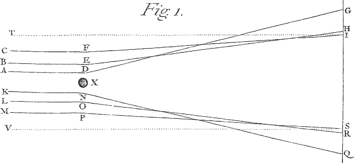 [Image 1]Sit igitur Circulus X, Capilli pars media: ADG, BEH, & CFI; tres radii, transeuntes prope unum latus extremum capilli, in diversis distantiis: KNQ, LOR, & MPS; alii tres radii, transeuntes prope alterum latus extremum capilli, in similibus distantiis: D, E, F, & N, O, P; loca ubi Radii Inflectuntur inter transeundum prope capillum: G, H, I, & Q, R, S; loca ubi Radii incidunt in Chartam GQ: IS, latitudo Umbræ capilli projectæ in Chartam: Et TI, VS; duo radii, transeuntes sine Inflectendo, (quum nimirum capillus submotus sit,) ad puncta I & S. Jam quidem manifestum est, Lumen id omne, quod inter binos illos radios TI & VS intervenit, Inflecti inter transeundum prope capillum, & detorqueri ex Umbra IS: Quippe siqua pars ejus Luminis non Inflecteretur; incideret utique in Chartam intra illam Umbram, eamque ibi illuminaret; contra, quam Experientia comperimus. Et quoniam, quando Charta magno intervallo distet a Capillo, Umbra valde lata est; ideoque radii TI & VS, magno intervallo distant interse: sequitur utique, capillum Agere in Radios Luminis, etiam majusculo quidem interjecto intervallo præter se transeuntes. At vero Agit is fortius in Radios propius se transeuntes; eaque Actio ita languescit gradatim, prout Radii majoribus interjectis intervallis transeunt; quomodo rem in Schemate expressam habes: Etenim hinc fit, ut Umbra capilli multo latior sit, pro ratione quidem distantiæ Chartæ a capillo, tum quum Charta propius a capillo distet, quam quum longius.