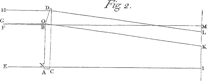Umbræ Corporum omnium, (Metallorum, Lapidum, Vitri, Ligni, Cornu, Glaciei, &c) in hoc Lumine collocatorum, fimbriatæ erant ternis inter se parallelis Luminis colorati limbis, sive fasciis; Quarum quidem fimbriarum ea, quæ esset Umbræ contigua, latissima erat ac luminosissima; quæ autem ab Umbra maxime distaret, ea & angustissima erat, tamque debilis, ut ægre cerni potuerit. Colores ipsarum difficile erat discernere & distinguere inter se; nisi quum Lumen exciperetur valde oblique Charta lævi, vel alio aliquo corpore albo, æquo ac plano; quod utique efficeret ut ii multo, quam alioqui, latiores apparrerent. Tumque Colores manifesto se exhibebant conspiciendos, hoc Ordine. Prima sive interior Fimbria, colore erat violaceo ac cæruleo saturo, proxime Umbram, deinceps cæruleo claro, viridi, ac flavo, in media sui parte; & rubeo, extra. Secunda Fimbria, ferme contigua erat primæ; & Tertia, secundæ; Ambæ autem, cæruleæ erant intra, & flavæ rubeæque extra; verum Colores ipsarum languidi erant admodum, tertiæ præsertim. Colores itaque ab usque Umbra, hoc erant Ordine dispositi; Violaceus, indicus, cæruleus pallescens, viridis, flavus, rubeus; cæruleus, flavus, rubeus; cæruleus pallescens, flavus pallescens, & rubeus. Umbræ bullularum & rasurarum, quæ forte in politis lamirati limbis fimbriatæ. Item, si laminæ Vitreæ, quales ad Specula solent adhiberi, sectæ in Obliquum prope Extrema sua, collocentur in antedicto Luminis radio; utique id Lumen, quod per parallelas transibit Vitri facies, fimbriatum erit istiusmodi Colorum limbis, qua parte eæ planæ facies committuntur cum planitie illa in Obliquum secta; hocque pacto apparebunt nonnunquam quator vel quinque Fimbriæ Colorum. Sint videlicet AB, CD, Facies Speculi parallelæ; & BD, planities secta in Obliquum, quæ scilicet cum facie AB in Angulo valde obtuso committatur ad B.[Image 2] Transeat jam id omne Lumen, quod inter radios ENI & FBM intervenit, recta per planas Vitri facies inter se parallelas, incidatque in Chartam inter I & M; quodque inter radios GO & HD intervenit, refringatur id omne per planitiem BD in obliquum sectam, incidatque in Chartam inter K & L: Jamque Lumen id, quod transit recta per planas Vitri facies inter se parallelas, inciditque in Chartam inter I & M; fimbriatum erit tribus pluribusve limbis colorum, ad M. Simili denique ratione, fiquis Solem per Plumam verl Tæniam nigram oculo proxime applicatam intueatur; videbit is multos Arcus coloratos; Umbris nimirum, quas Fibræ vel Fila illa tenuia in Tunicam Retinam projiciunt, ejusmodi Fimbrias colorum sibi adjunctas habentibus.