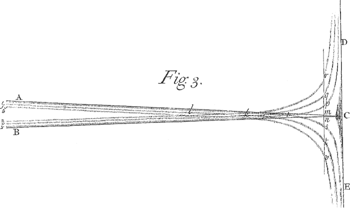 Quum Cultrorum Umbrarum Fimbriæ inciderent ad perpendiculum super Chartam magno intervallo objectam; videbantur eæ Hyperbolarum forma ac specie, mensurasque habebant illas quæ sequuntur. Sint CA & CB, lineæ super Chartam ductæ, Cultrorum aciebus parallelæ, & inter quas Lumen Omne inter Cultros transmissum incideret utique, si id inter Cultrorum Acies plane sine Inflectendo foret transmissum:[Image 3] Sitque DE, linea recta per punctum C ducta; qua & Anguli ACD, BCE, inter se fiant æquales; & Lumen id omne, quod incidit in Chartam a Punto ubi Cultrorum Acies concurrunt, terminetur: Porro, sint eis, fkt, & glv, tres lineæ hyperbolicæ, repræsentantes Terminum Umbræ Cultri unius, lineam obscuram inter Fimbrias primam & secundam istius Umbræ, & lineam obscuram inter Fimbrias secundam et tertiam ejusdem Umbræ: & xip, ykq, & zlr, aliæ tres lineæ hyperbolicæ, repræsentantes Terminum Umbræ Cultri alterius, lineam obscuram inter Fimbrias primam & secundam Umbræ istius, & lineam obscuram inter Fimbrias secundam & tertiam ejusdem Umbræ. Finge tres hasce Hyperbolas, similes & æquales esse tribus prioribus, easque in transversum secar in punctis i, k, & l; Umbrasque Cultrorum terminari, & a primis fimbriis luminosis distingui, per lineas eis & xip; usque eo donec fimbriæ illæ inter se concurrant, & sese mutuo in transversum secent; tumque deinde lineas istas Fimbriis ipsis incurrere, & tanquam totidem lineas tenebrosas secare eas in obliquum, Terminantes deinceps primas luminosas fimbrias ab interiore sui parte, easque distinguentes ab alio quodam lumine, quod incipit porro apparere in i, illuminatque totum spatium triangulum ipDEs, definitum lineis illis obscuris & linea recta DE. Jam quidem harum Hyperbolarum Asymptotos una, est linea ipsa DE; alteræ autem earundem Asymptoti, parallelæ sunt lineis CA & CB. Sit igitur r v linea ducta ubivis super Chartam, parallela Asymptoto DE; secetque hæc linea lineas rectas AC in m & BC in n, & lineas sex Hyperbolicas obscuras in punctis p, q, r, s, t, u: Jamque dimetiendo distantias ps, qt, rv; indeque colligendo Longitudines Ordinatarum np, nq, nr, vel ms, mt, mv; idque in diversis distantiis lineæ rv ab Asymptoto DE; utique invenire poteris quot libuerit puncta harum Hyperbolarum; indeque intelligere, lineas hasce curvas, esse utique Hyperbolas, parum admodum distantes ab Hyperbolis conicis: Item dimetiendo lineas Ci, Ck, Cl; invenire poteris alia harum curvarum puncta.