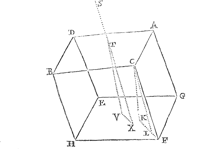 Sit ADBC, Superficies Crystalli refringens; C, Angulorum solidorum ad istam superficiem maximus; GEHF, Superficies ex adverso opposita; & CK, linea isti Superficiei perpendicularis. Hæc linea perpendicularis, cum Crystalli acie extrema CF, angulum continet graduum 19, 3′. Junge KF; & in ea sume KL ita, ut Angulus KCL sit graduum 6, 40′; angulus autem LCF, graduum 12, 23′. Quo facto, si jam linea ST repræsentet radium aliquem Luminis incidentem ad T, quovis Angulo, in Superficiem refringentem ADBC; esto TV Radius refractus; Is autem, quis sit, invenietur ex data illa proportione Sinuum, 5 ad 3, secundum usitatas Optices Leges. Ducatur deinde VX, parallela & æqualis lineæ KL; ducatur autem ita, ut jaceat illa ad easdem partes a V, ad quas L jacet a K; Et junge TX; Eritque hæ linea TX, radius refractus alter, inusitata videlicet Refractione delatus a T ad X.
