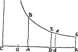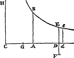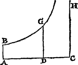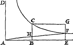 describatur hyperbola BG, sintque AB, DG ad asymptoton AC perpendiculares, & exponatur tum corporis velocitas tum resistentia medii, ipso motus initio, per lineam quamvis datam AC, elapso autem tempore aliquo per lineam indefinitam DC: exponi potest tempus per aream ABGD, & spatium eo tempore descriptum per lineam AD. Nam si area illa per motum puncti D augeatur uniformiter ad modum temporis, decrescet recta DC in ratione geometrica ad modum velocitatis, & partes rectæ AC æqualibus temporibus descriptæ decrescent in eadem ratione.