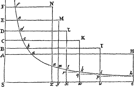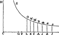 Exponatur enim vis gravitatis per datam lineam AC; resistentia per lineam indenfinitam AK; vis absoluta in descensu corporis per differentiam KC; velocitas corporis per lineam AP, quæ sit media proportionalis inter AK & AC, ideoque in subduplicata ratione resistentiæ; incrementum resistentiæ data temporis particula factum per lineolam KL, & contemporaneum velocitatis incrementum per lineolam PQ; & centro C asymptotis rectangulis CA, CH describatur hyperbola quævis BNS, erectis perpendiculis AB, KN, LO occurrens in B, N, O. Quoniam AK est ut APq, erit hujus momentum