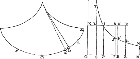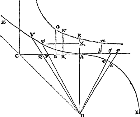 Corol 2. Unde si capiantur innumeræ CR, vel, quod perinde est, innumeræ ZX in progressione geometrica; erunt totidem Xr in progressione arithmetica. Et hinc curva DraF per tabulam logarithmorum facile delineatur.