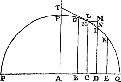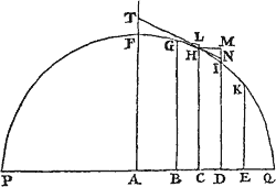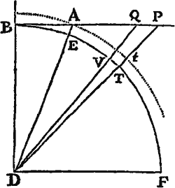 est ADq, & per hypothesin APq est . Ergo particulæ sunt ad invicem ut ADq ad ; id est, ut AD ad seu AC ad CK: ideoque sectoris particula TDV est ; atque ideo ob datas AC & AD, ut , id est, ut incrementum velocitatis directe, utque vis generans incrementum inverse; atque ideo ut particula temporis incremento respondens. Et componendo fit summa particularum temporis, quibus omnes velocitatis AP particulæ PQ generantur, ut summa particularum sectoris ADT, id est, tempus totum ut sector totus. Q.E.D.