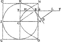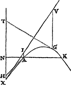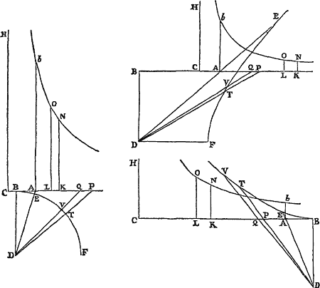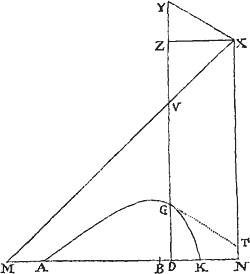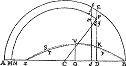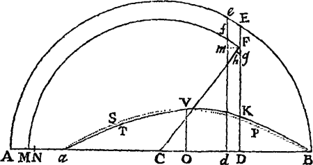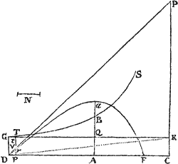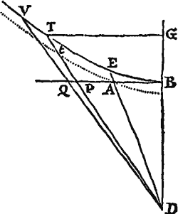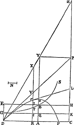 projectile secundum lineam quamvis rectam DP, & per longitudinem DP exponatur ejusdem velocitas sub initio motus. A puncto P ad lineam horizontalem DC demittatur perpendiculum PC, & secetur DC in A, ut sit DA ad AC ut resistentia medii, ex motu in altitudinem sub initio orta, ad vim gravitatis; vel (quod perinde est) ut sit rectangulum sub DA & DP ad rectangulum sub AC & CP ut resistentia tota sub initio motus ad vim gravitatis. Asymptotis DC, CP describatur hyperbola quævis GTBS secans perpendicula DG, AB in G & B; & compleatur parallelogrammum DGKC, cujus latus GK secet AB in Q. Capiatur linea N in ratione ad QB qua DC sit ad CP; & ad rectæ DC punctum quodvis R erecto perpendiculo RT, quod hyperbolæ in T, & rectis EH, GK, DP in I, t & V occurrat; in eo cape Vr æqualem , vel quod perinde est, cape Rr æqualem ; & projectile tempore DRTG perveniet ad punctum r, describens curvam lineam DraF, quam punctum r semper tangit, perveniens autem ad maximam altitudinem a in perpendiculo AB, & postea semper appropinquans ad asymptoton PC.. Estque velocitas ejus in puncto quovis r ut curvæ tangens rL.Q.E.I.