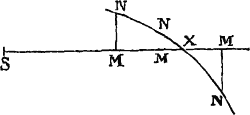ad alteram; & per puncta N, N, N agatur curva regularis NNN secans rectam SMMM in X, & erit SX vera ratio resistentiæ ad gravitatem, quam invenire oportuit. Ex hac ratione colligenda est longitudo DF per calculum; & longitudo, quæ sit ad assumptam longitudinem DP, ut longitudo DF per experimentum cognita ad longitudinem DF modo inventam, erit vera longitudo DP. Qua inventa, habetur tum curva linea DraF quam corpus describit, tum corporis velocitas & resistentia in locis singulis.