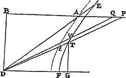 Cas. 2. Agatur DQV abscindens tum sectoris DAV, tum trianguli DAQ particulas quam minimas TDV & PDQ; & erunt hæ particulæ ad invicem ut DTq ad DPq, id est (si TX & AP parallelæ sint) ut DXq ad DAq vel TXq ad APq, & divisim ut ad . Sed ex natura hyperbolæ