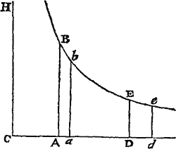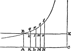 BACH in rectangula innumera Ak, Kl, Lm, Mn, &c. quæ sint ut incrementa velocitatum æqualibus totidem temporibus facta; & erunt nihil, Ak, Al, Am, An, &c. ut velocitates totæ, atque ideo (per hypothesin) ut resistentia medii principio singulorum temporum æqualium. Fiat AC ad AK vel ABHC ad ABkK ut vis gravitatis ad resistentiam in principio temporis secundi, deque vi gravitatis subducantur resistentiæ, & manebunt ABHC, KkHC, LlHC, MmHC, &c. ut vires absolutæ quibus corpus in principio singulorum temporum urgetur, atque ideo (per motus legem II.) ut incrementa velocitatum, id est, ut rectangula Ak, Kl, Lm, Mn, &c; & propterea (per lem. I. lib. II.) in progressione geometrica. Quare si rectæ Kk, Ll, Mm, Nn, &c. productæ occurrant hyperbolæ in q, r, s, t, &c. erunt areæ ABqK, KqrL, LrsM, MstN, &c. æquales, ideoque tum temporibus tum viribus gravitatis semper æqualibus analogæ. Est autem area ABqK (per corol. 3. lem. VII. & lem. VIII. lib. I.) ad aream Bkq ut Kq ad seu AC ad , hoc est, ut vis gravitatis ad resistentiam in medio temporis primi. Et simili argumento areæ qKLr, rLMs, sMNt, &c. sunt ad areas qklr, rlms, smnt, &c. ut vires gravitatis ad resistentias in medio temporis secundi, tertii, quarti, &c. Proinde cum areæ æquales BAKq, qKLr, rLMs, sMNt, &c. sint viribus gravitatis analogæ, erunt areæ Bkq, qklr, rlms, smnt, &c. resistentiis in mediis singulorum temporum, hoc est (per hypothesin) velocitatibus, atque ideo descriptis spatiis analogæ. Sumantur analogarum summæ, & erunt areæ Bkq, Blr, Bms, Bnt, &c. spatiis totis descriptis analogæ; necnon areæ ABqK, ABrL, ABsM, ABtN, &c. temporibus. Corpus igitur inter descendendum, tempore quovis ABrL, describit spatium Blr, & tempore LrtN spatium rlnt. Q.E.D. Et similis est demonstratio motus expositi in ascensu. Q.E.D.