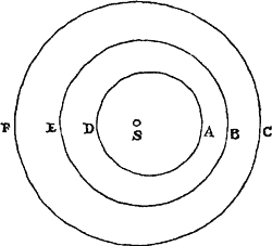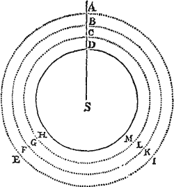 circa solem delati revolvuntur in ellipsibus umbilicum habentibus in sole, & radiis ad solem ductis areas describunt temporibus proportionales. At partes vorticis tali motu revolvi nequeunt. Designent AD, BE, CF, orbes tres circa solem S descriptos, quorum extimus CF circulus fit soli concentricus, & interiorum duorum aphelia sint A, B & perihelia D, E. Ergo corpus quod revolvitur in orbe CF, radio ad solem ducto areas temporibus proportionales describendo, movebitur uniformi cum motu. Corpus autem quod revolvitur in orbe BE, tardius movebitur in aphelio B & velocius in perihelio E, secundum leges astronomicas; cum tamen secundum leges mechanicas materia vorticis in spatio angustiore inter A & C velocius moveri debeat quam in spatio latiore inter D & F; id est, in aphelio velocius quam in perihelio. Quæ duo repugnant inter se. Sic in principio signi virginis, ubi aphelium martis jam versatur, distantia inter orbes martis & veneris est ad distantiam eorundem orbium in principio signi piscium ut ternarius ad binarium circiter, & propterea materia vorticis inter orbes illos in principio piscium debet esse velocior quam in principio virginis in ratione ternarii ad binarium. Nam quo angustius est spatium per quod eadem materiæ quantitas eodem revolutionis unius tempore transit, eo majori cum velocitate transire debet. Igitur si terra in hac materia cœlesti relative quiescens ab ea deferretur, & una circa solem revolveretur, foret hujus velocitas in principio piscium ad ejusdem velocitatem in principio virginis in ratione sesquialtera. Unde solis motus diurnus apparens in principio virginis major esset quam minutorum primorum septuaginta, & in principio piscium minor quam minutorum quadraginta & octo: cum tamen (experientia teste) apparens iste solis motus major sit in principio piscium quam in principio virginis, & propterea terra velocior in principio virginis quam in principio piscium. Itaque hypothesis vorticum cum phænomenis astronomicis omnino pugnat, & non tam ad explicandos quam ad perturbandos motus cœlestes conducit. Quomodo vero motus isti in spatiis liberis sine vorticibus peraguntur intelligi potest ex libro primo, & in mundi systemate plenius docebitur.