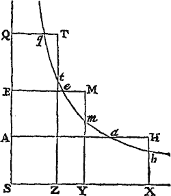 conjunctis rationibus, ut quadrata distantiarum inverse. Quare si ad infinitæ rectæ SABCDEQ partes singulas erigantur perpendicula Aa, Bb, Cc, Dd, Ee, &c. ipsarum SA, SB, SC, SD, SE, &c. quadratis reciproce proportionalia, & per terminos perpendicularium duci intelligatur linea curva hyperbolica; erunt summæ differentiarum, hoc est, motus toti angulares, ut respondentes summæ linearum Aa, Bb, Cc, Dd, Ee, id est, si ad constituendum medium uniformiter fluidum, orbium numerus augeatur & latitudo minuatur in infinitum, ut areæ hyperbolicæ his summis analogæ AaQ, BbQ, CcQ, DdQ, EeQ, &c. Et tempora motibus angularibus reciproce proportionalia, erunt etiam his areis reciproce proportionalia. Est igitur tempus periodicum particulæ cujusvis D reciproce ut area DdQ, hoc est (per notas curvarum quadraturas) directe ut distantia SD. Q.E.D.