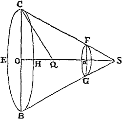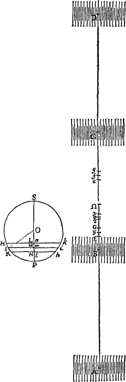 in extremis itus & reditus cujusque locis P & S, a vi elastica quæ ipsius ponderi æquetur; peraget hæc vibrationes singulas quo tempore eadem in cycloide, cujus perimeter tota longitudini PS æqualis est, oscillari posset: id adeo quia vires æquales æqualia corpuscula per æqualia spatia simul impellent. Quare cum oscillationum tempora sint in subduplicata ratione longitudinis pendulorum, & longitudo penduli æquetur dimidio arcui cycloidis totius; foret tempus vibrationis unius ad tempus oscillationis penduli, cujus longitudo est A, in subduplicata ratione longitudinis seu PO ad longitudinem A. Sed vis elastica, qua lineola physica EG, in locis suis extremis P, S existens, urgetur, erat (in demonstratione propositionis XLVII.) ad ejus vim totam elasticam ut ad V, hoc est (cum punctum K jam incidat in P) ut HK ad V: & vis illa tota, hoc est pondus incumbens, quo lineola EG comprimitur, est ad pondus lineolæ ut ponderis incumbentis altitudo A ad lineolæ longitudinem EG; ideoque ex æquo, vis qua lineola EG in locis suis P & S urgetur, est ad lineolæ illius pondus ut ad , sive ut ad VV, nam HK erat ad EG ut PO ad V. Quare cum tempora, quibus æqualia corpora per æqualia spatia impelluntur, sint reciproce in subduplicata ratione virium, erit tempus vibrationis unius, urgente vi illa elastica, ad tempus vibrationis, urgente vi ponderis, in subduplicata ratione VV ad , atque ideo ad tempus oscillationis penduli cujus longitudo est A in subduplicata ratione VV ad , & subduplicata ratione PO ad A conjunctim; id est, in ratione integra V ad A. Sed tempore vibrationis unius ex itu & reditu compositæ, pulsus progrediendo conficit latitudinem suam BC. Ergo tempus, quo pulsus percurrit spatium BC, est ad tempus oscillationis unius ex itu & reditu compositæ, ut V ad A, id est, ut BC ad circumferentiam circuli cujus radius est A. Tempus autem, quo pulsus percurret spatium BC, est ad tempus quo percurret longitudinem huic circumferentiæ æqualem, in eadem ratione; ideoque tempore talis oscillationis pulsus percurret longitudinem huic circumferentiæ æqualem. Q.E.D.