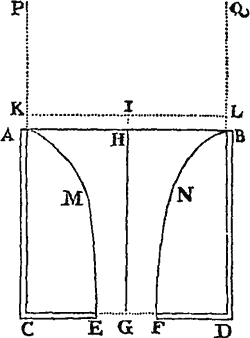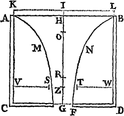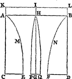 Longitudinem aquæ mensuro secundum axes canalis & crurum, eandem summæ horum axium æquando; & resistentiam aquæ, quæ oritur ab attritu canalis, hic non considero. Designent igitur AB, CD mediocrem altitudinem aquæ in crure utroque; & ubi aqua in crure KL ascendit ad altitudinem EF, descenderit aqua