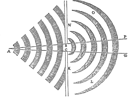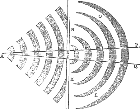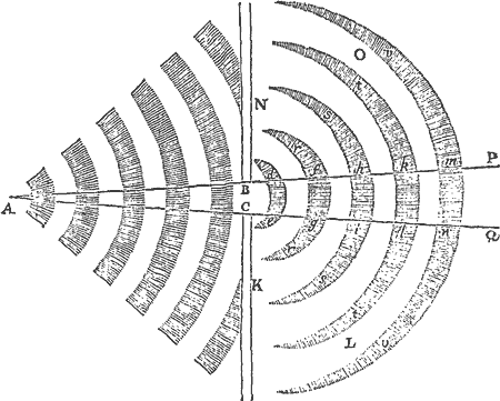 Cas. 2. Ponamus jam quod de, fg, hi, kl, mn designent pulsus a puncto A per medium elasticum successive propagatos. Pulsus propagari concipe per successivas condensationes & rarefactiones medii, sic ut pulsus cujusque pars densissima sphæricam occupet superficiem circa centrum A descriptam, & inter pulsus successivos æqualia intercedant intervalla. Designent autem lineæ de, fg, hi, kl, &c. densissimas pulsuum partes, per foramen BC propagatas. Et quoniam medium ibi densius est quam in spatiis hinc inde versus KL & NO, dilatabit sese tam versus spatia illa KL, NO utrinque sita, quam versus pulsuum rariora intervalla; eoque pacto rarius semper evadens e regione intervallorum ac densius e regione pulsuum, participabit eorundem motum. Et quoniam pulsuum progressivus motus oritur a perpetua relaxatione partium densiorum versus antecedentia intervalla rariora; & pulsus eadem fere celeritate sese in medii partes quiescentes KL, NO hinc inde relaxare debent; pulsus illi eadem fere celeritate sese dilatabunt undique in spatia immota KL, NO, qua propagantur directe a centro A; ideoque spatium totum KLON occupabunt. Q.E.D. Hoc experimur in sonis, qui vel monte interposito audiuntur, vel in cubiculum per fenestram admissi sese in omnes cubiculi partes dilatant, inque angulis omnibus audiuntur, non tam reflexi a parietibus oppositis, quam a fenestra directe propagati, quantum ex sensu judicare licet.