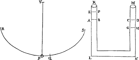 in crure MN ad altitudinem GH. Sit autem P corpus pendulum, VP filum, V punctum suspensionis, RPQSS cyclois quam pendulum describat, P ejus punctum infimum, PQ arcus altitudini AE æqualis. Vis, qua motus aquæ alternis vicibus acceleratur & retardatur, est excessus ponderis aquæ in alterutro crure supra pondus in altero, ideoque, ubi aqua in crure KL ascendit ad EF, & in crure altero descendit ad GH, vis illa est pondus duplicatum aquæ EABF, & propterea est ad pondus aquæ totius ut AE seu PQ ad VP seu