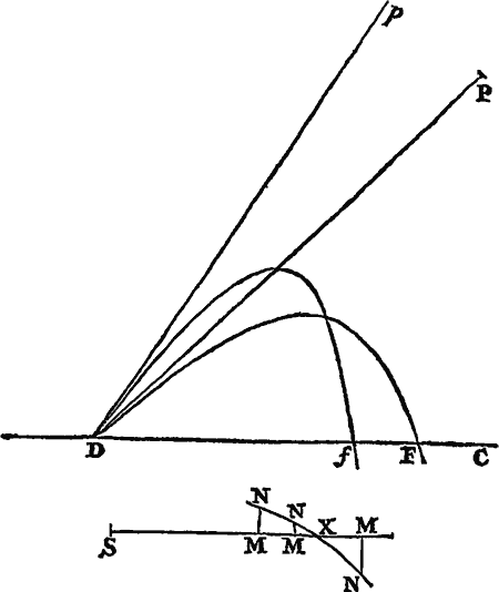 Corol. 7. Unde liquet methodus determinandi curvam DraF ex phænominis quamproxime, & inde colligendi resistentiam & velocitatem quacum corpus projicitur. Projiciantur corpora duo similia & æqualia eadem cum velocitate, de loco D, secundum angulos diversos CDP, CDp & cognoscantur loca F, f, ubi incidunt in horizontale planum DC. Tum, assumpta quacunque longitudine pro DP vel Dp, fingatur quod resistentia in D sit ad gravitatem in ratione qualibet, & exponatur ratio illa per longitudinem quamvis SM. Deinde per computationem, ex longitudine illa assumpta DP, inveniantur longitudines DF, Df, ac de ratione per calculum inventa, auferatur ratio eadem per experimentum inventa, & exponatur differentia per perpendiculum MN. Idem fac iterum ac tertio, assumendo semper novam resistentiæ ad gravitatem rationem SM, & colligendo novam differentiam MN. Ducantur autem differentiæ affirmativæ ad unam partem rectæ SM, & negativæ