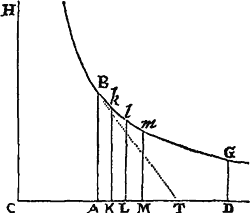 Nam quoniam quadrato velocitatis proportionalis est resistentia medii, & resistentiæ proportionale est decrementum velocitatis; si tempus in particulas innumeras æquales dividatur, quadrata velocitatum singulis temporum initiis erunt velocitatum earundem differentiis proportionalia. Sunto temporis particulæ illæ AK, KL, LM, &c. in recta CD sumptæ, & erigantur perpendicula AB, Kk, Ll, Mm, &c. hyperbolæ BklmG, centro C asymptotis rectangulis CD, CH descriptæ, occurrentia in B, k, l, m, &c. & erit AB ad Kk ut CK ad CA, & divisim ad Kk ut AK ad CA, & vicissim ad AK ut Kk ad CA, ideoque ut ad . Unde, cum AK & dentur, erit ut ; & ultimo, ubi coeunt AB & Kk, ut ABq. Et simili argumento erunt , , &c. ut Kk quad. Ll quad. &c. Linearum igitur AB, Kk, Ll, Mm quadrata sunt ut earundem differentiæ; & idcirco cum quadrata velocitatum fuerint etiam ut ipsarum differentiæ, similis erit ambarum progressio. Quo demonstrato, consequens est etiam ut