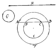 its perimeter at the middle being AFD, & at the end BEC, & the top of the liquor ABCD. Also let G be a circle whose semidiameter is equall to the difference of the semidiameters of the other two circles AFD & BEC, & H the whole length of the vessel. Find by a table or instrument composed for that purpose, the segments AFD, & BEC, & the whole circle G; & shall be the whole quantity of the liquor in the vessel. This rule is not exact but approaches the content of the Parabolick spindle exactly enough for practice when the op of the liquor buts upon the end of the vessell. If the vessel be just half full tis exact; if more then half full, tis something to little; if lesse than half full, too much.