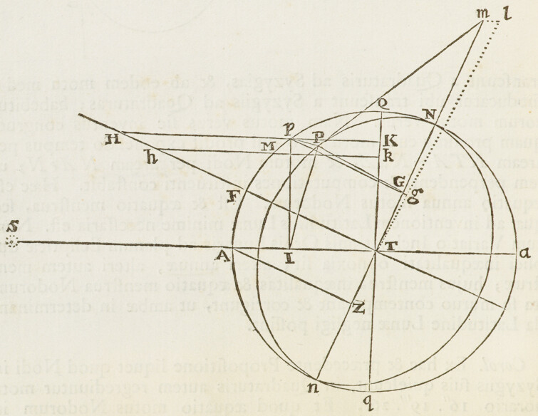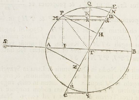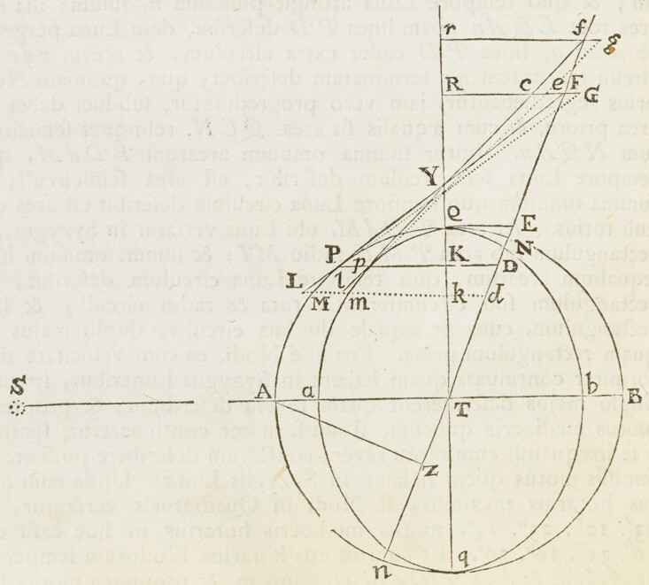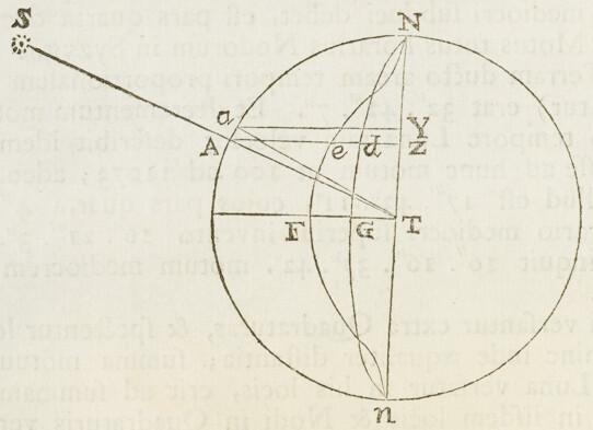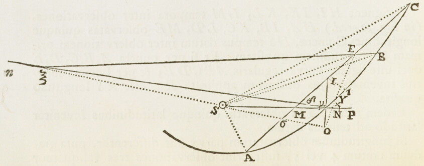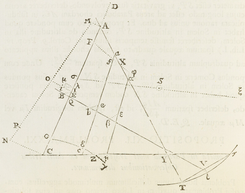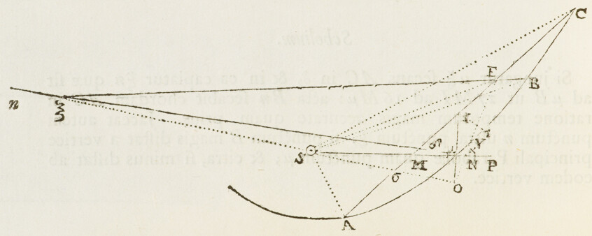 Jam ad orbem Cometæ determinandum; selegi ex observationibus hactenus descriptis tres, quas Flamstedius habuit Dec. 21, Jan. 5. & Jan. 25. Ex his inveni St partium & Vt partium 455, quales 10000 sunt semidiameter Orbis magni. Tum ad operationem primam assumendo tB partium 5657, inveni SB 9747, BE prima vice 412, Sμ 9503, iλ 413: BE secunda vice 421, OD 10186, X , MP 8450, MN 8475, NP 25. Unde ad operationem secundam collegi distantiam tb 5640. Et per hanc operationem inveni tandem distantias TX 4775 & τZ 11322. Ex quibus Orbem definiendo, inveni Nodos ejus descendentem in ♋ & ascendentem in ♑ 1gr. 53′; Inclinationem plani ejus ad planum Eclipticæ 61gr. ; verticem ejus (seu perihelium Cometæ) distare a Nodo 8gr. 38′, & esse in ♐ 27gr. 43′ cum latitudine australi 7gr. 34′; & ejus latus rectum , areamque radio ad Solem ducto singulis diebus descriptam 93585, quadrato semediametri Orbis magni posito 100000000; Cometam vero in hoc Orbe secundum seriem signorum processisse, & Decemb. 8d. 0h. 4′. P. M. in vertice Orbis seu Perihelio fuisse. Hæc omnia per scalam partium æqualium & chordas angulorum ex Tabula sinuum naturalium collectas, determinavi Graphice; construendo Schema satis amplum, in quo videlicet semidiameter Orbis magni (partium 10000) æqualis esset digitis pedis Anglicani.