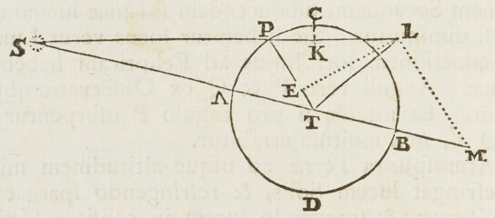 Die ♄ni, Mart. 5. hor. . P. M. Cometa existente in T, recta MT æqualis erat , & recta LT producta transibat inter B & F, quadruplo vel quintuplo propior F quam B, auferens a BF quintam vel sextam ejus partem versus F. Et MT producta transibat extra spatium BF ad partes stellæ B, quadruplo propior existens stellæ B quam stellæ F. Erat M stella perexigua quæ per Telescopium videri vix potuit, & L stella major quasi magnitudinis octavæ.