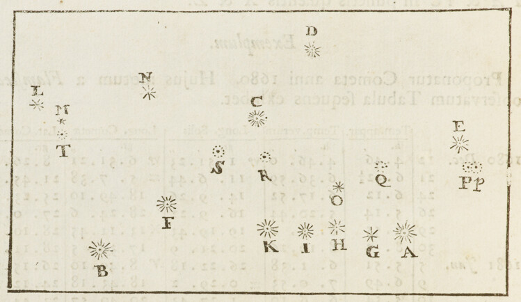 Hæ observationes Telescopio septupedali, & Micrometro filisque in foco Telescopii locatis paractæ sunt: quibus instrumentis & positiones fixarum inter se & positiones Cometæ ad fixas determinavimus. Designet A stellam in sinistro calcaneo Persei (Bayero ο) B stellam sequentem in sinistro pede (Bayero ζ) & C, D, E, F, G, H, I, K, L, M, N, O stellas alias minores in eodem pede. Sintque P, Q, R, S, T loca Cometæ in observationibus supra descriptis: & existente distantia AB partium , erat AC partium , BC , ADC , BD , CD , AE , CE , DE , AI , BI , CI ,