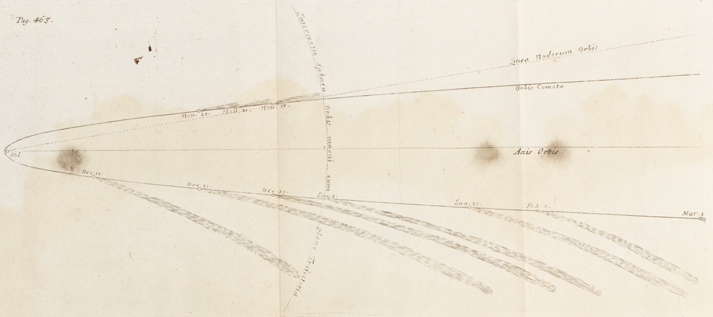 Cæterum Trajectoriam quam Cometa descripsit, & Caudam veram quam singulis in locis projecit, visum est annexo schemate in plano Trajectoriæ optice delineatas exhibere: Observationibus sequentibus in Cauda definienda adhibitis.