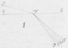 [4]De luce itaque compertum habeo, quòd radij ejus quoad quantitatem refractionis ab invicem differunt: Ex ijs qui omnes habent eundem angulum incidentiæ, alij angulum refractionis aliquantò majorem alijs habebunt. Plenioris illustrationis gratiâ, sit EFG superficies quælibet refringens puta vitrea; Et ducàtur quævis OF
