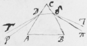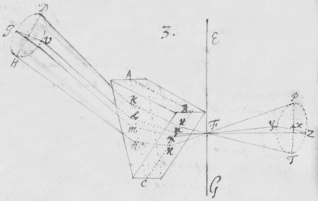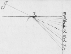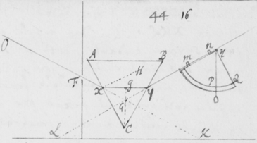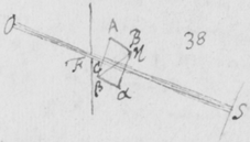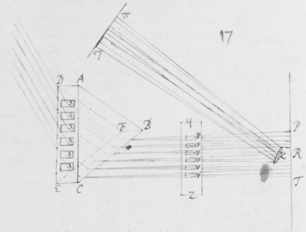 [57]Verùm cùm tot prismata in situ tam accurato disponere, propter motum solis et alia incommoda difficile forsan et laboriosum simul inveniatur, nisi adhibeatur Machina quædam eâ de causâ fabricata ut ejus ope prismata in desiderato situ figantur: alium propterea modum profero quo ista negotio leviori, idque unico prismate periclitari poteris. Sumatur papyrus vel aliud opacum