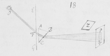 [32]In figura 12 Sit F foramen valde exiguum per quod lumen Solis trajiciatur: deinde ad distantiam pro lubitu magnam statuatur Prisma ABC, per quod radij transeant