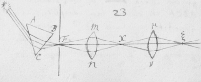 [23]Cæterum ad isthæc experienda Lentes adhiberi vellem quarum foci sunt longinqui, sex fortè vel duodecim pedibus a lentibus distantes, modò tales præsto sunt: Saltem non sint minùs distantes quàm duobus{.} Atque etiam latera Prismatis debent esse accuratè plana. Sin latera ejus sint aliquatenus convexa tum præstat adhibere lentem cujus focus ad pedes tantùm duos tresve a se remotus est. Quibus paratis Lentem Prismati ex utravis parte vicinam colloca: ita scilicet ut radios per se trajectos directè respiciat. Deinde radij in papyrum aliquam excipiantur, quam ultrò citróque transfer, donec imaginem coloratam utrinque rectis parallelis distinctissimè terminatam videas.