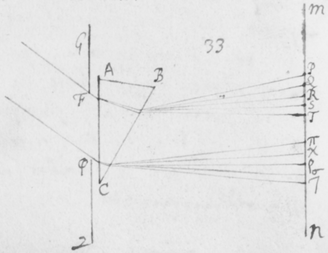 [60]Sed responsio multiplex in promptu est: et imprimis inquam quòd cùm umbræ coloribus interjectæ primùm evanescunt removendo papyrum PT, colores tamen non ideo pereunt neque minimùm immutantur donec incipiant misceri per remotiorem distantiam papyri. Et albedo non producitur donec per distantiam adhuc remotiorem mistura radiorum omnis generis evadat perfecta. Unde confinium umbræ non est necessarium ad colores producendos, neque albedo generatur ex isto sublato.