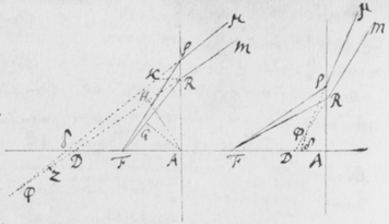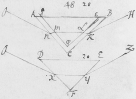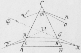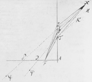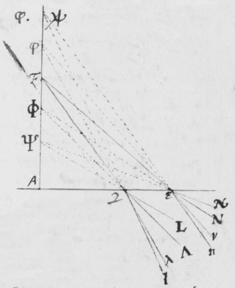 [7]Angulos autem istos PFT et YFZ æquales esse sic demonstro. Concipe radium aliquem a P per κ et N retrocedere, dum alius radius pergit a D per K et ν: Itaque cùm anguli AKD, & BκF supponuntur æquales, erunt etiam anguli per primas refractiones facti AKν et BκN æquales. Unde triangula CKν & CκN erunt similia et eorum anguli externi κNA, KνB æquales; et proinde anguli per secundas refractiones facti ANH & BνF etiam æquales{.} Quare cùm anguli AKD & BκF, item ANH et BνF sint æquales, eorum differentiæ erunt etiam æquales, hoc est angulus νFκ sive PFT æqualis angulo quem radij DK et HN comprehendunt, sive diametro solari. Est itaque angulus PFT æqualis diametro solari: Quare cùm præterea demonstratum fuerit, quod angulus YFZ æquatur eidem diametro, liquebit propositum. Istud autem ut fiat, Theorema quoddam more Lemmatis præsternendum est quod cùm postea nobis forsam erit ex usu, jam facere non pigebit.