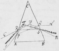 [17]Verùm cùm in experiendis prædictis, eam esse positionem Prismatis supposuerim ut radij ad utramque faciem Prismatis æqualiter refringantur: Conclusionis loco, dicam quâ ratione istud citò fiat, et facilè. Si Prisma teneatur in luce solari & motu lento circa suum axin convertatur, videbis colores quòs efficit, de loco in locum continuo motu translatos esse, ita quidem ut aliquando progredi, deinde verò regredi videantur. Observabis itáque medietatem inter istos contrarios motus, quando colores modò progressi et statim regressuri, videntur sistere. Quod ubi vides siste Prisma, et in eo situ fige. Dico factum. Scilicet in eo citu summa refractionum utrobique factarum, sive radij emergentis ad incidentem inclinatio evadit omnium minima; quod cum accidit, refractiones utrobique sunt æquales, uti posthac demonstrabitur.