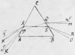 [40]Itáque ad institutum redeo de coloribus secundum præcedentes quatuor propositiones explicatis disceptaturus. Et ad propositionem primam quod attinet, utpote quòd ex radijs similitèr incidentibus maximè refracti purpuram efficiant, minimè refracti ruborem, et refracti mediocriter colores mediocres, ea pateant ex antedictis. [41]Quippe notissimum est quòd colores Prismatis purpureus, cæruleus, viridis, flavus, & rubeus ita sese ab P versus T in ordine nominato subsequuntur, ut purpureus color ad P semper jaceat in angulo TFO radijs incidentibus OF ijsque FT ad colorem rubeum T refractis contento: atque adeò ut radij ad purpuram tendentes magis deflectant a directo cursu, sive magis refringantur quàm illi qui tendunt ad rubedinem.