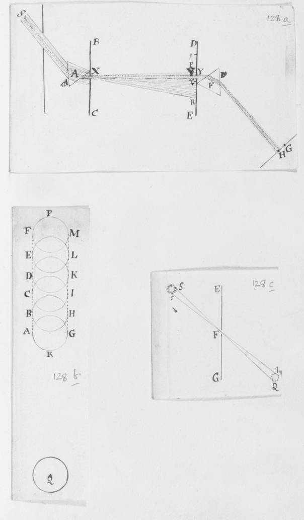 [58]In hisce autem experiendis cavendum est ut oblonga foramina λ sint accuratè æqualia et æqualibus distantijs ab invicem dissita, nè luce magis copiosâ per aliquod ingressâ quàm per cætera, colores exinde generati prævaleant cæteris et misturam perfectam conturbent: et sic vice albedinis colores apparebunt hinc illinc more fortuito sparsi. Illa verò distantia rimarum λ ut et earundem latitudo non malè statuitur fore pars digiti circiter duodecima, aut eâ fortè major si prisma satis amplum adhibeas. Quinetiam si cupias ut experimentum sit omnibus numeris absolutum, vice prismatum vitreorum vulgò venalium (quæ sunt nimis gracilia) debes amplioribus uti qualia possis efficere ex laminis vitreis utrinque perpolitis et conjunctis in morem vasculi prismiformis, quod vasculum impleatur aquâ clarissimâ, et undique cemento obturetur. Non multùm refert quænam sit hujus longitudo, sufficit ut sit trium digitorum, sed refringentia latera debent esse quatuor vel sex digitos lata aut ampliùs, ut rimæ præfatæ λ cum distantijs earum fiant majores et plures et magis accuratæ. Sin utaris angustioribus, qualia vulgò venduntur; colores externi juxta P ac T dilatando priùs destruent interjectam albedinem quam perficiatur per remotionem papyri PT. Et illa præterea quæ in totum constant ex vitro, colore aliquo ut viridi vel flavo plerumque tinguntur, et radios ita tingunt in transitu ut albedinem perfectam exhibere nequeant.